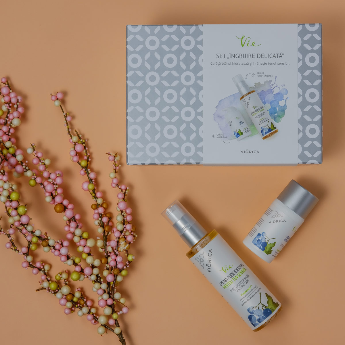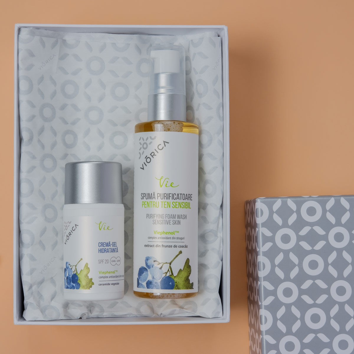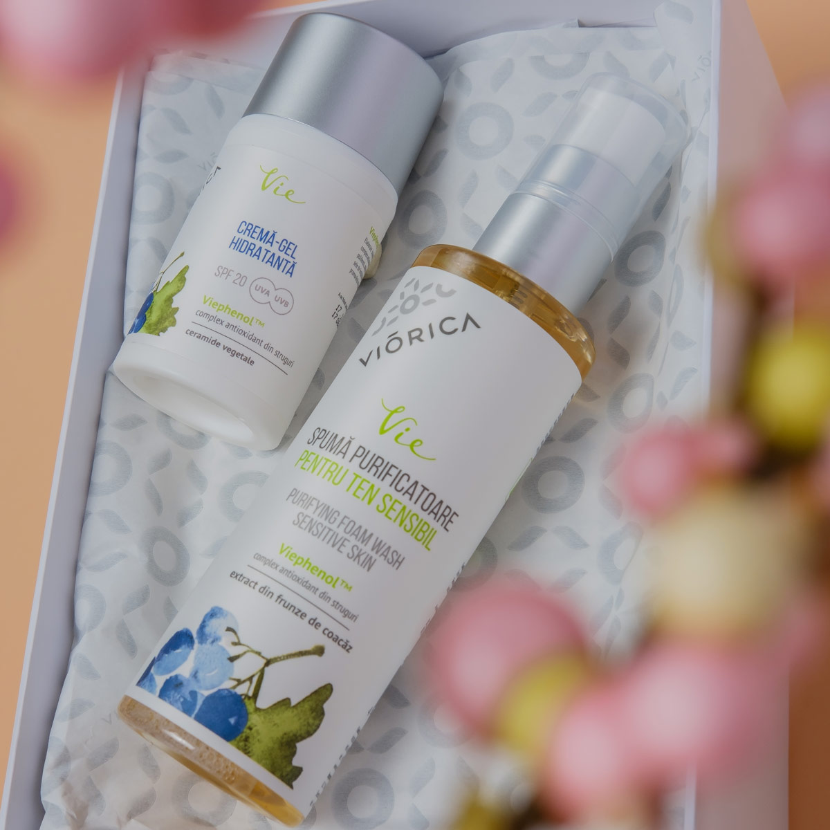 Toate produsele „VIORICA VIE” au fost create pe bază de ViephenolTM – un complex antioxidant unic, extras din struguri moldovenești. Complexul are un conținut deosebit de ridicat de proantocianidină – un antioxidant natural rar întâlnit. ViephenolTM previne eficient fotoîmbătrânirea, stimulează producerea de colagen și susține regenerarea pielii la nivel celular.